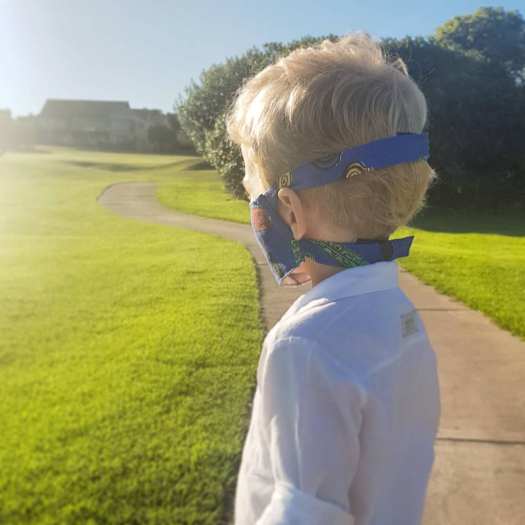 Make sure the mask fits over their nose and mouth, stretching from ear-to-ear and below the chin. Use elastic bands or velcro straps to make it easy to put on. Model good mask-wearing behaviour to your child and remember to make it part of a game / tell them they are a super-hero to encourage them to keep the masks on while in public places.